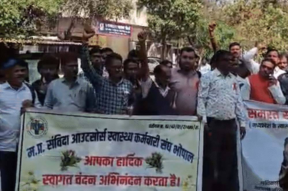 मध्यप्रदेश के सरकारी अस्पतालों में सेवाएं दे रहे लगभग 30 हजार आउटसोर्स स्वास्थ्य कर्मचारी भोपाल में प्रदर्शन कर रहे हैं। मप्र संविदा आउटसोर्स स्वास्थ्य कर्मचारी संघ के आह्वान पर बड़ी संख्या में कर्मचारी जेपी परिसर में पहुंच गए हैं और नारेबाजी कर रहे हैं। दोपहर एक बजे न्याय यात्रा शुरू होगी, जो मुख्यमंत्री निवास तक जाएगी। जहां 9 सूत्रीय मांगों को लेकर ज्ञापन सौंपा जाएगा।
