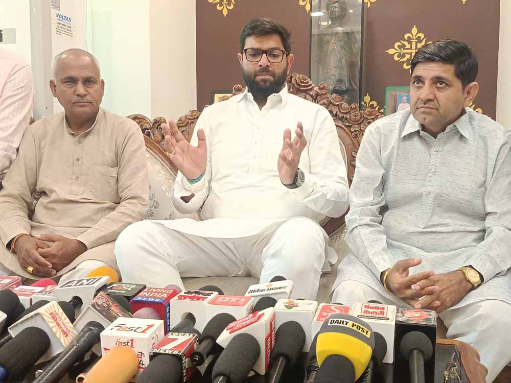 भिवानी के देवीलाल सदन में मीडिया से बात करते दिग्विजय चौटाला।